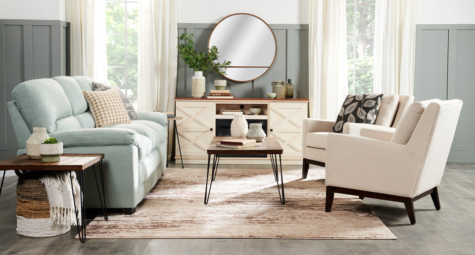 As the finishing touch, bring in one or two accent colours to tie the space together. You can use this colour throughout the room, selecting throw pillows, lampshades, upholstery, cushions and more. Also, if you feel like you have too many wood furniture pieces in a room, you can incorporate painted wood pieces or metallic pieces to accent the rest of the space.