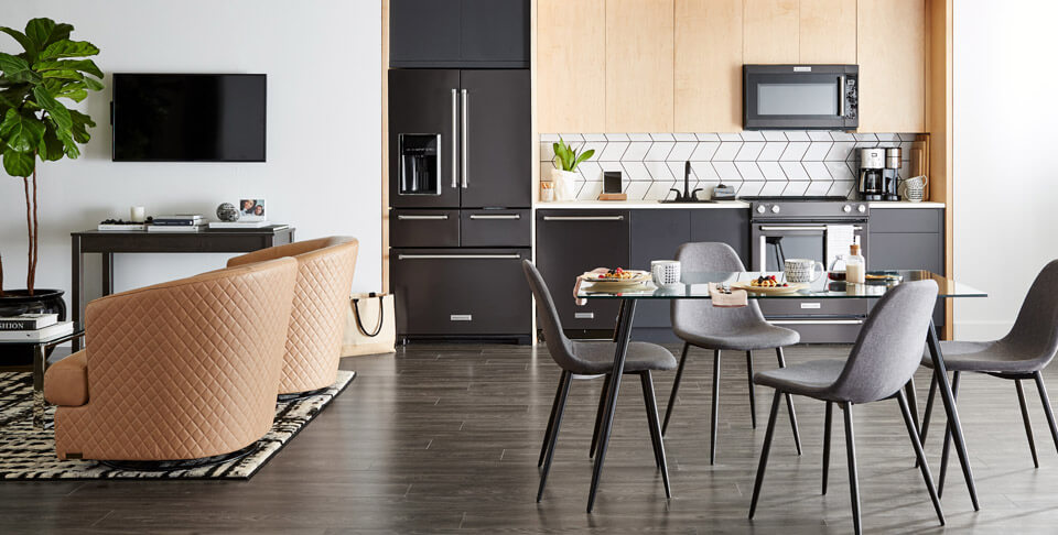 - A navy accent chair: An accent chair in a bold, yet neutral color, such as the Sylvie Linen-Look Fabric Modular Chair, serves as both a statement piece, as well as a functional seat.