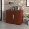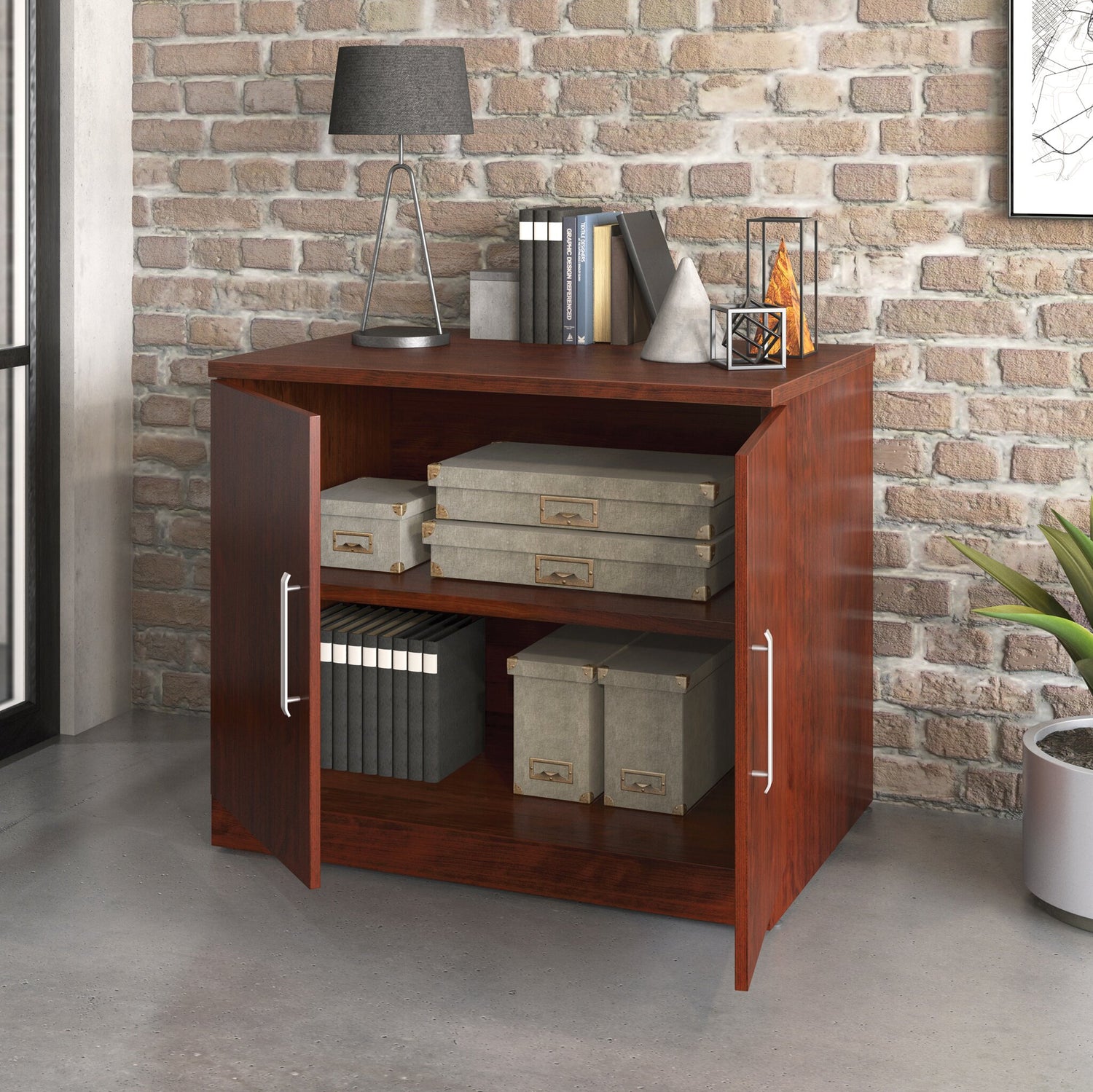 Quit piling and start storing with this Affirm cabinet. The commercial storage unit features a durable melamine top with enough room for books, office decor and a lamp. Plus, it's heat-, stain- and scratch-resistant. High-grade thermoplastic edges are added for impact resistance, making the unit durable for even the toughest jobs. A large adjustable shelf behind the door allows for versatile options to stash your largest books or smallest office accessories. Finished in cherry red, this storage cabinet is as stylish and design-forward as it is functional.