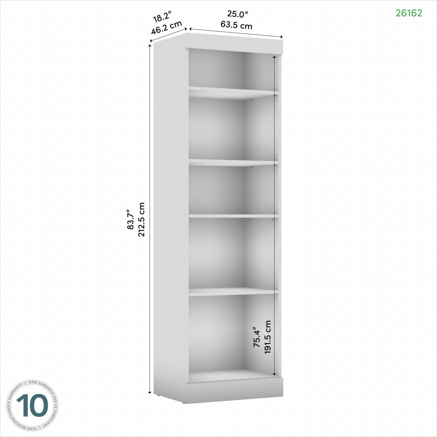 The Bestar Pur 25W Closet Organizer is a great storage solution for small spaces. This shelving unit serves as the perfect tall narrow bookshelf, linen cabinet, closet organizer, or simply as a great way to round out your bedroom set. Add the storage cabinet to your Pur Collection Murphy Bed (sold separately) to finish off your room with all the storage you need, or set up the unit wherever you need extra organization. Thanks to its sleek look, this tall bookcase is sure to match your home decor style. The closet organizer includes two fixed and three adjustable/removable shelves to allow for customizable decoration or storage of any room, from your bathroom to your home office. Move the shelves as you see fit to accommodate objects of various sizes. The bookshelf packs plenty of vertical storage into a compact footprint so you can get organized without overwhelming your home. For a combination of open and concealed storage, add a 3 Drawer Set from the Pur collection (sold separately). You can also place lovely bins and baskets on the shelves to organize small items or hide clutter. This shelf organizer is backed by the Bestar 10 Year Manufacturer’s Warranty. North American made with globally sourced materials.