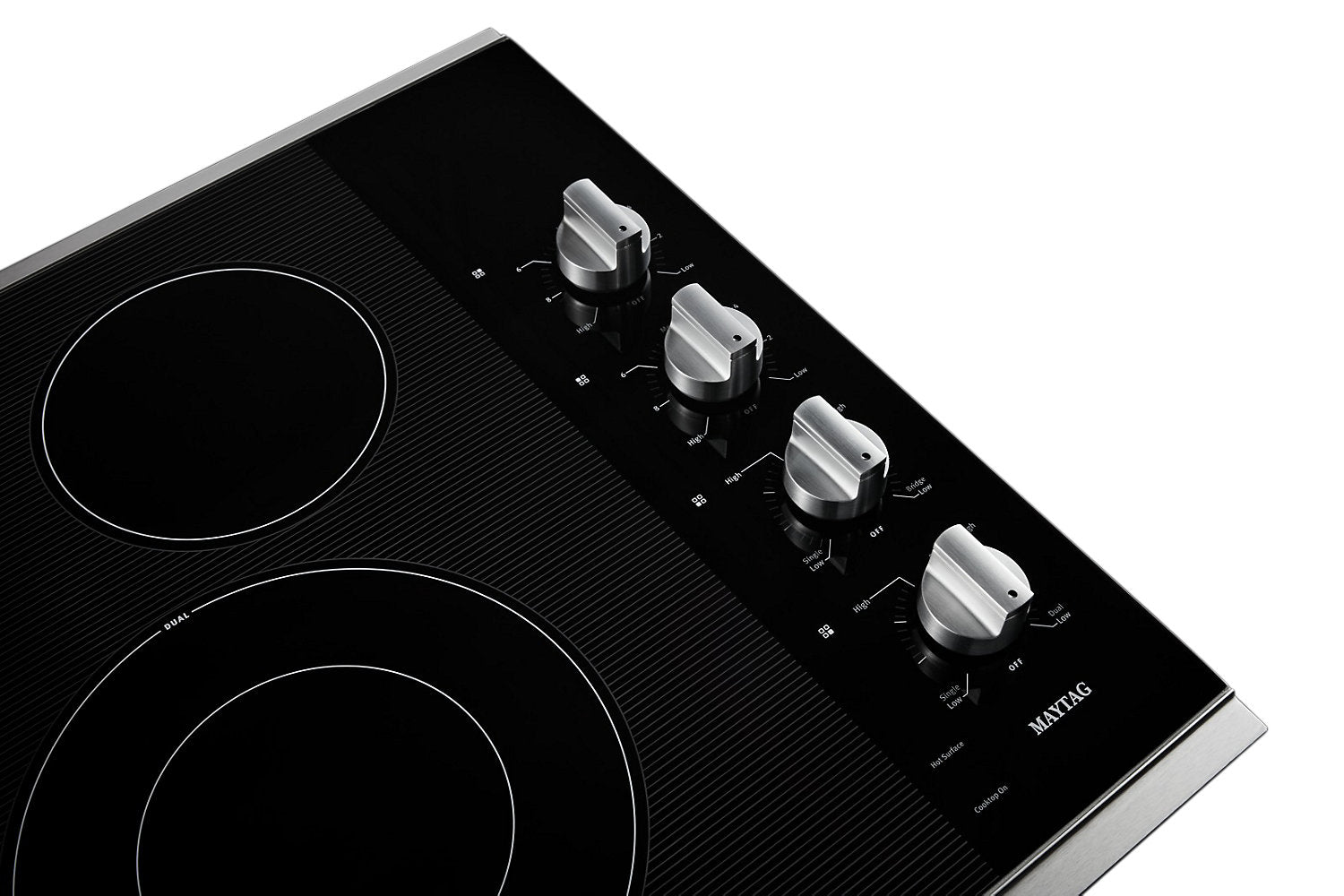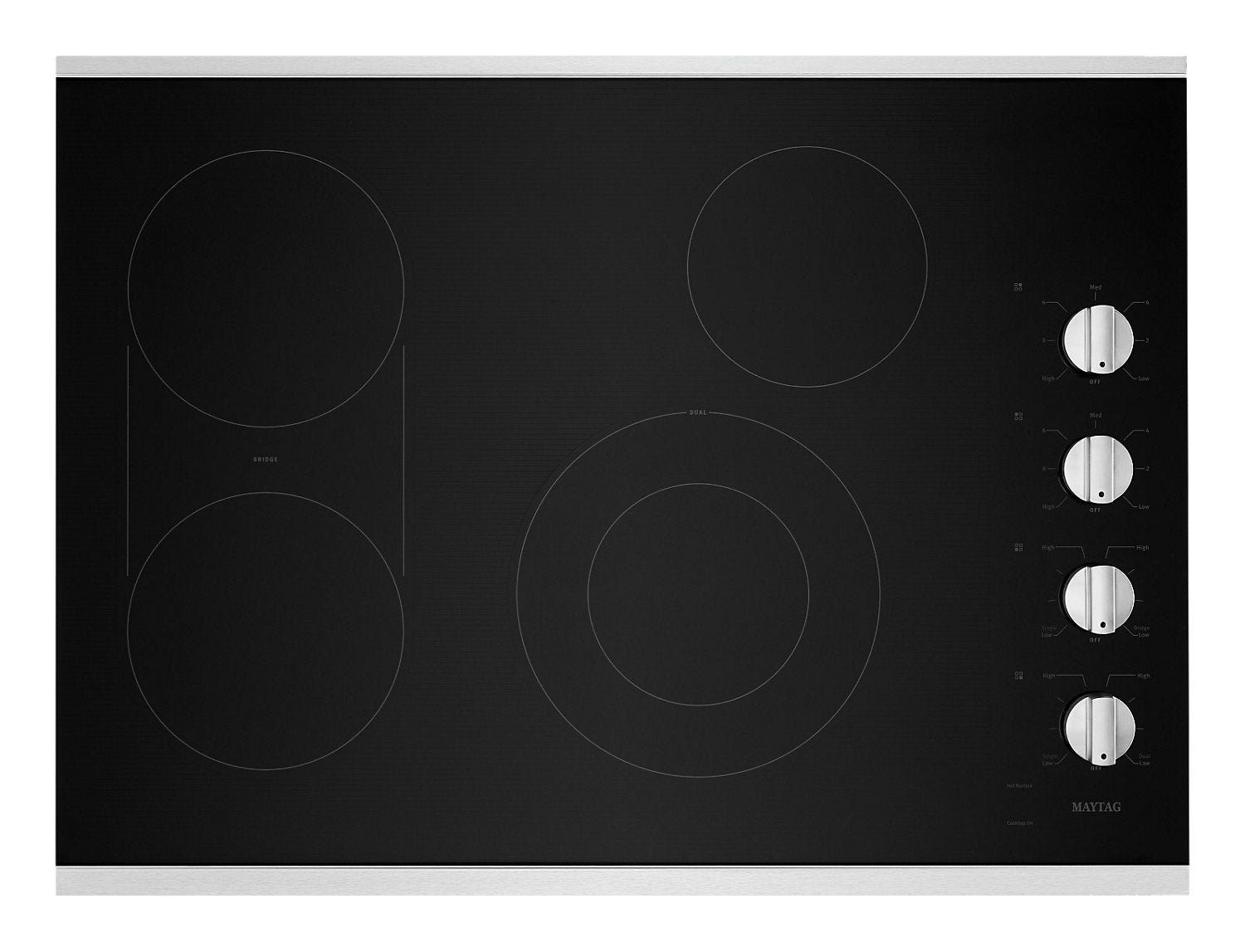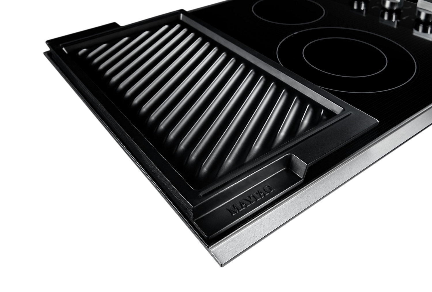 You're in control with the Maytag exclusive electric cooktop with reversible grill and griddle. Sizzle food using your regular pans on one of the four powerful elements, or whip up delicious paninis or grilled veggies on the included reversible grill and griddle. Powerful when and where you need it, simply fire up the variable-sized Dual-Choice™ element and select the most efficient size for your pots and pans, or link the bridge element for large casserole dishes. Finally, heavy-duty knobs add an elegant touch to your countertop while also lasting for years.
