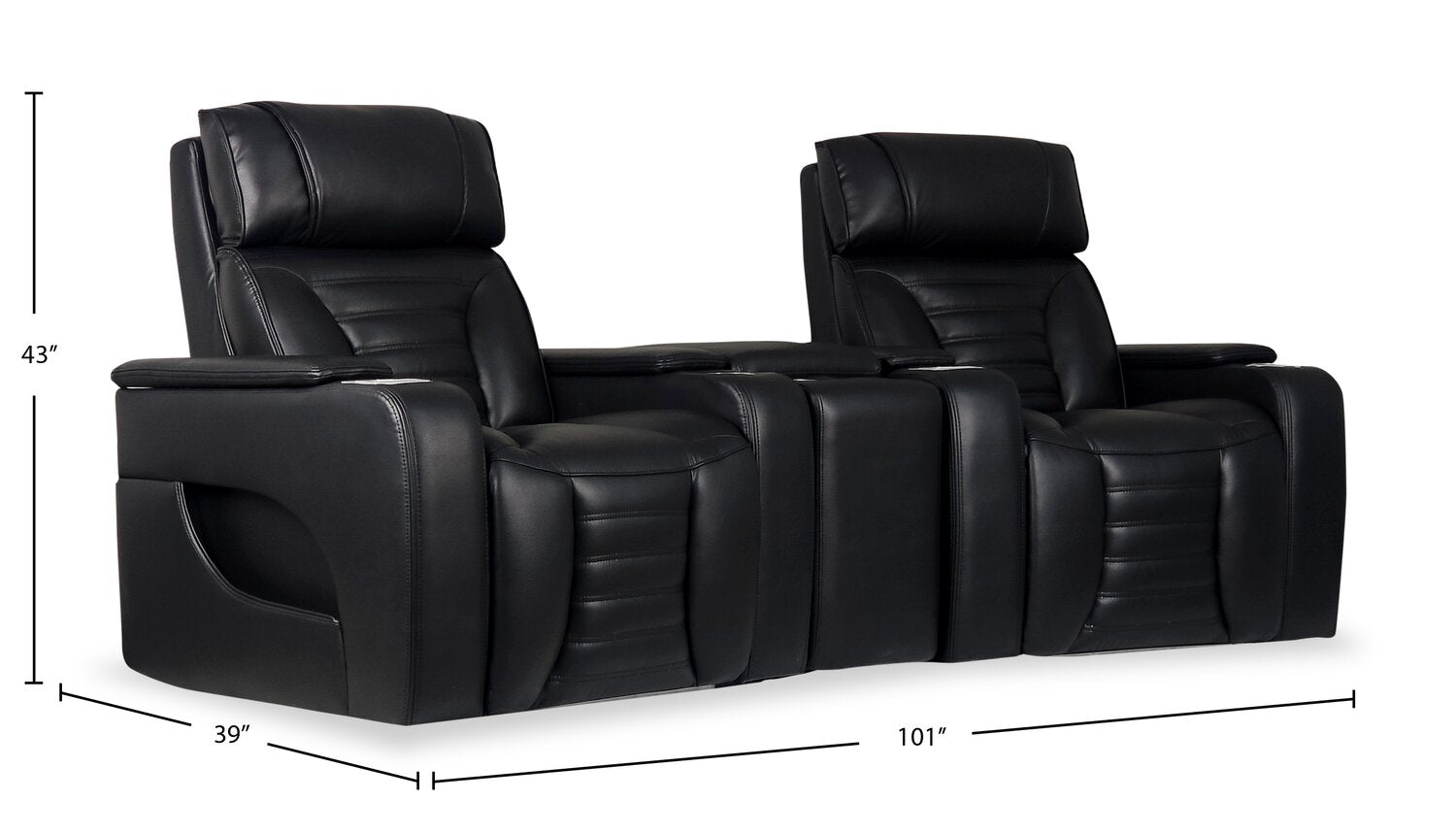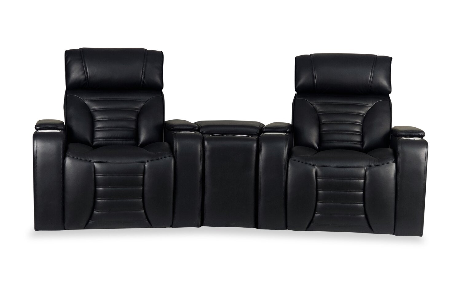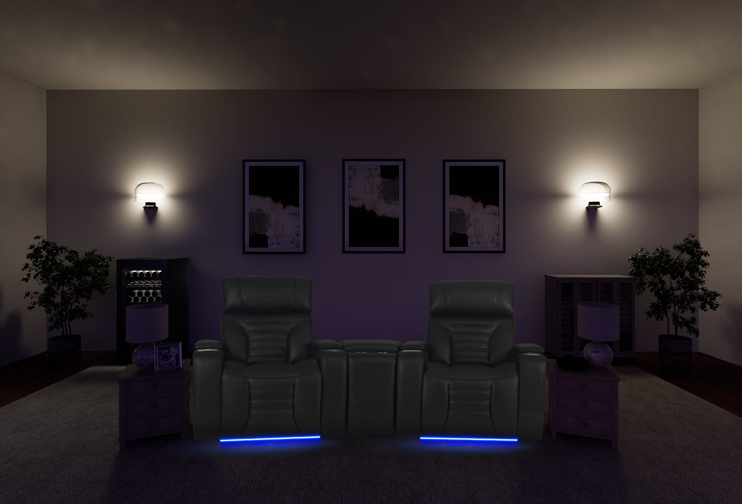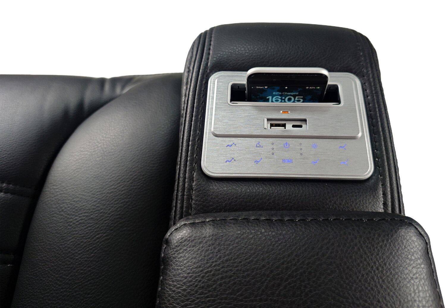 Transport yourself to a state of elevated relaxation with this Zen power reclining massage home theatre sectional. As you set to immerse yourself in a great film, smooth faux leather and high-density foam cushions envelope you in utmost comfort. Set the mood with soft LED lighting and bask in the convenience offered by the wireless USB charging port. Plus, keep your snacks and remotes close by in the storage console and armrests. Enjoy simple heated seating, therapeutic massaging and power reclining as you treat yourself to the best form of relaxation with the Zen and infuse tranquility into your home.