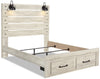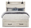 Shine some light on bedtime relaxation with this Abby queen storage bed. Rustic and industrial styles collide in natural-looking wood with a light white finish and dark metal nailheads. Two LED-powered sconce lights built into the headboard provide some extra illumination for when you want to stay up late and read just one more chapter. A pair of USB ports means that you'll never have to worry about your phone dying in the middle of the night again. Two drawers built into the footboard give you extra space for clothing or blankets. Curl up on the Abby tonight, and let some light into your dreams.