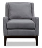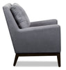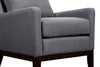 Savour your time at home with the comfort of this stylish dark grey Adel accent chair. Linen-look fabric envelops this piece for a charming and chic appeal. Both the seat and back cushion feature a mix of soft fibre fill and robust foam to ensure you stay snug while you binge watch your favourite TV shows. While the upholstery provides a neutral base to emphasize however you want, the dark brown wood legs reach up to frame the chair's base with fashionable stability. Keep your living space looking modern and inviting with this elegantly designed Adel accent chair.