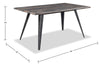 Gather your family around this rustic-modern Amos dining table. Lying on top of the wood tabletop is woodgrain-patterned paper laminate, creating an easy-to-maintain outdoorsy look. To take the natural feel even further, the live-edge look framing the surface features dips and points similar to those found on old barn boards. Grey metal legs splay out from the table's corners for durable support and contemporary style. Enjoy gathering your friends and family around this Amos table.