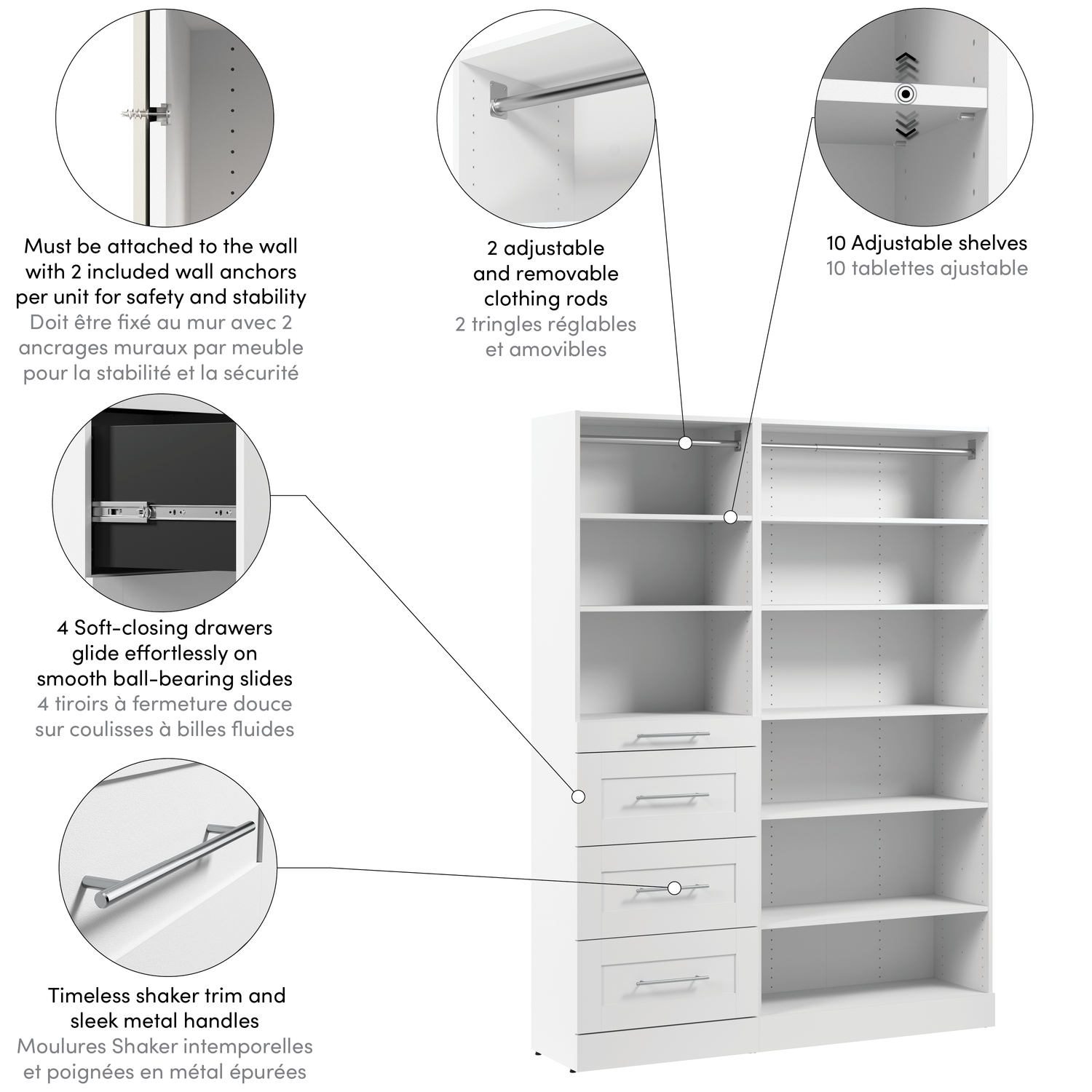Enjoy the freedom to tailor your closet exactly as you envision it with the Bestar Florence 61W x 16D Modular Reach-In/Walk-In Closet System with Shelves and Drawers Shaker Style. Imagine creating the space you want, right within the space you have. Space that keeps your belongings organized and easy to find — so your favourite sweater isn’t hiding, but right where you need it. With 10 adjustable shelves, 4 smooth-gliding and soft-closing drawers, and 2 removable clothing rods, you can arrange each element to fit your needs — whether you’re maximizing shelf space for folded essentials or adding hanging room for garments. It’s designed to help you add, swap and rearrange each component to stay ultra-organized as life unfolds. The classic shaker trim and modern metal handles add a timeless, stylish touch to your closet. Crafted from eco-conscious materials, this system embodies Bestar’s dedication to sustainability and quality.