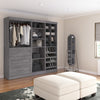 The Bestar Pur 86W Closet Organizer System is perfect to create your dream closet anywhere you like. With ingenious shoe storage, spacious drawers, practical clothing rods, and adjustable shelving, this organizer offers efficient and versatile closet storage. It’s ideal for a walk-in closet but can also be used against a wall in your bedroom, guest room or even in the hallway next to your room. This clothes organizer also makes a great entryway storage solution. The pieces can be used separately for a customized configuration that suits your needs and your space. If your dresser or small closet is not cutting it anymore, it’s time to upgrade your clothing storage with this stylish wardrobe organizer. Hang your favorite outfits on the clothing rod and store other clothing items and personal belongings in the closet drawers. Move the shelves as you see fit to accommodate bags and decor items of various sizes. The shoe closet organizer features a combination of cubbies for storage bins and spacious slanted shelves with lips to prevent items like shoes, handbags, and clothes from sliding off. The shoe cabinet is perfect to organize your shoe collection. The closet drawers come with metal handles and a shaker-inspired trim for a beautiful transitional design that will perfectly complement your home decor. This closet system is backed by the Bestar 10 Year Manufacturer’s Warranty. North American made with local and imported parts.