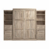 The Bestar Pur Queen Murphy Bed and 2 Shelving Units with Drawers (115W) is the ideal space saver for a multipurpose room. The mattress support uses flexible slats that follow the curves of the body and absorb pressure for maximum comfort. The Queen Murphy bed can be used every night for a good night’s sleep. The bed folds up and down smoothly thanks to the dual piston system. The wall bed accommodates most standard Queen mattresses (8-12 inches thick, 60-90 lb, 60 x 80 inches) and supports up to 1000 lb. The open bed extends 92 inches from the wall. The cabinet must be anchored to a wall with a minimum ceiling height of 91. 1 inches. Allow a clearance of 30-36 inches around the open bed. The shelving units come with 2 fixed and 3 adjustable shelves and 3 drawers to hold your belongings. The dual-mount wall bed mechanism attaches to the floor and wall for maximum stability and durability. To avoid risk of injury, the Murphy bed must be installed to wall and floor structure by a professional or qualified person. Two people are required for assembly. Installation requires attachment to wood studs or masonry, removal of the baseboard, and drilling into the floor (if disassembly is required, holes may be covered with baseboards 0. 5 inches or thicker). Necessary hardware is included. Do not use this product for children or pets under 50 pounds (22. 7 kg). This bundle is backed by the Bestar 10 Year Manufacturer’s Warranty. North American made with globally sourced materials.