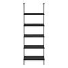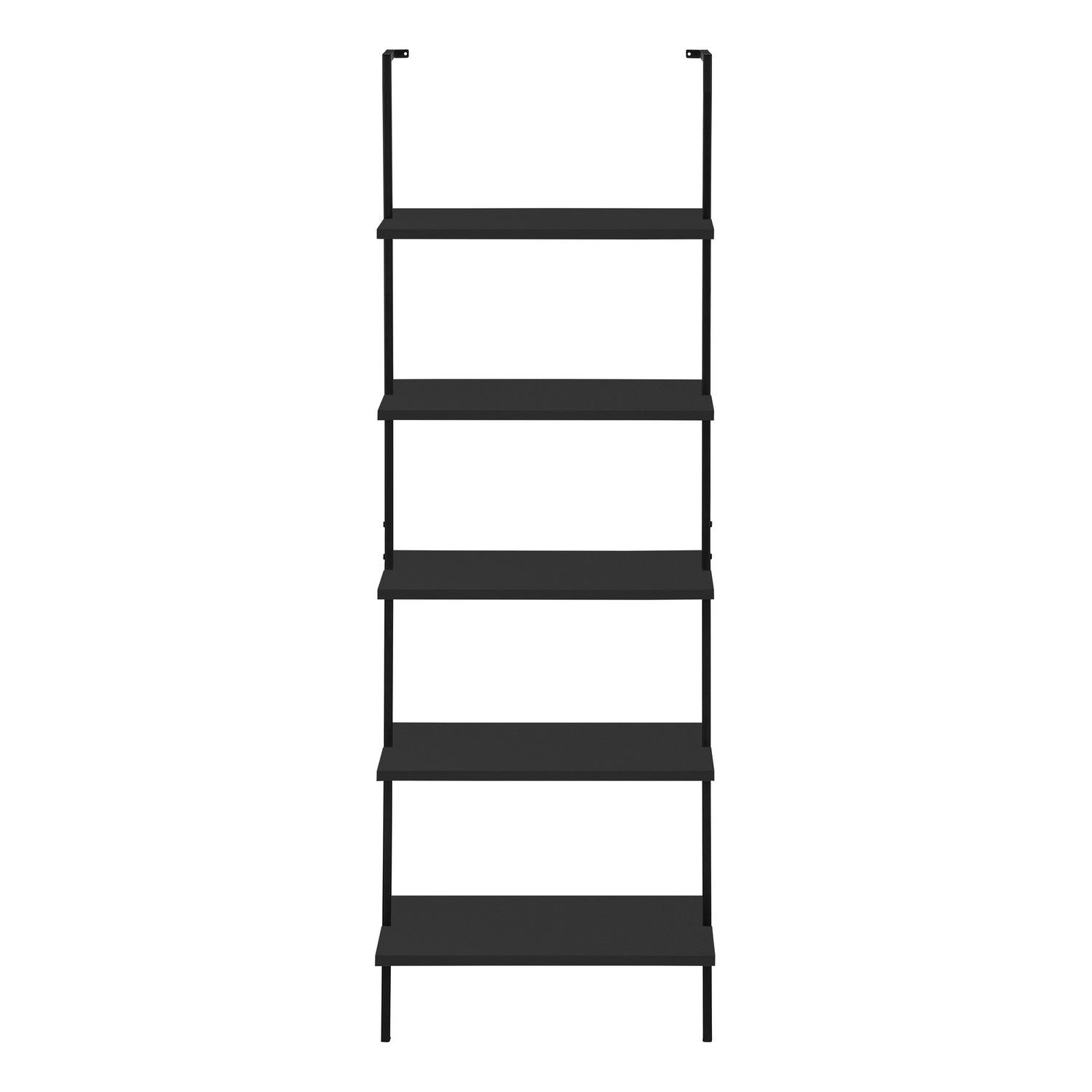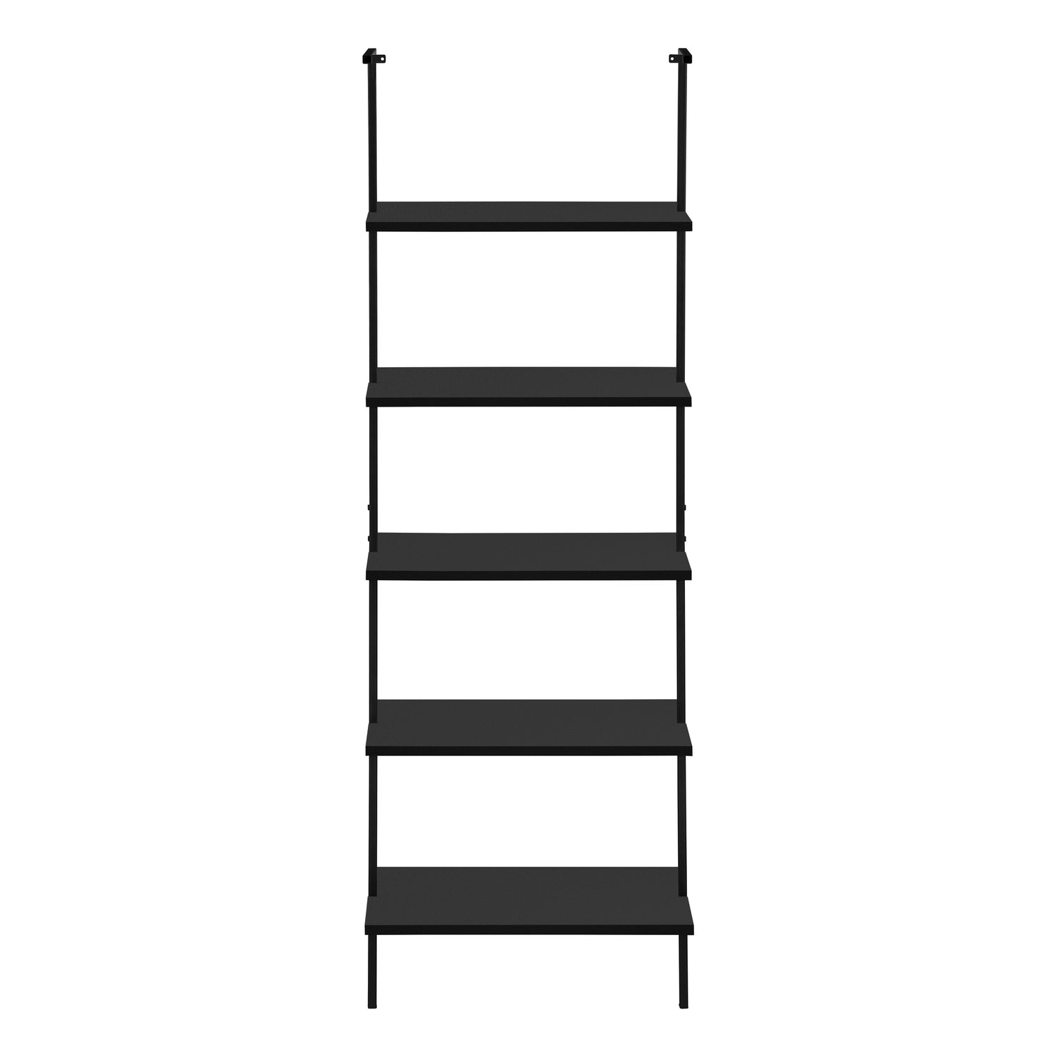 This charming and minimalist ladder bookcase is a great way to bring a modern style to your decor. It is crafted with an open black metal frame that mounts to the wall to keep it in place. Five tier ample shelving made from engineered wood in a matching black finish and provide the perfect place for books, plants, bar essentials, or anything else you want to display. Mount this tall and narrow space-saving bookshelf to the wall in your home office, living room, or bedroom.