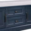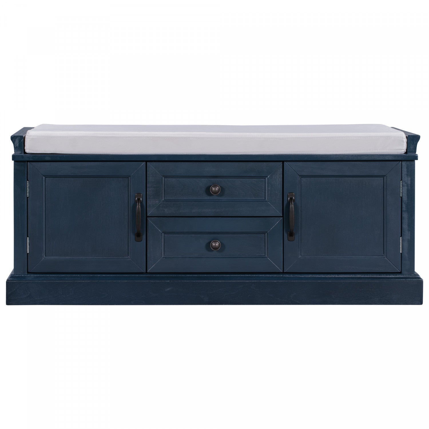 Keep your entryway organized with the storage bench, combining classic design with everyday functionality. This bench features four doors with adjustable shelves, perfect for storing shoes, books, or other essentials. Crafted from solid wood and mdf, it offers long-lasting durability. A removable 2. 2-inch velvet cushion provides comfort while sitting. Retro-style aluminum handles add a vintage touch, making this bench a stylish addition to your hallway, mudroom, or living room.