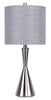 Chic modern style imbues the shape and sheen of this brushed nickel table lamp. Glistening lines and sleek angles converge in its refined presentation. Showcasing a bold round base that curves into a pinched middle, the lustrous brushed nickel body is crowned with a beautiful grey textured drum shade. Whether resting on your nightstand, set on a side table in the den, or tucked into your favorite reading nook, this lamp is a sharp addition to almost any aesthetic.