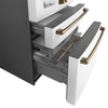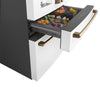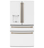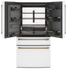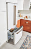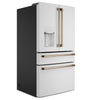 This stunning Café refrigerator is a masterpiece of design and convenience. An illuminated dispenser ensures you can always stay hydrated with filtered ice and water. Plus, a versatile middle drawer with flexible temperature range and glass dividers can be used to maximize fridge or freezer storage. This model features a matte white finish and brushed bronze handles. Customizing this elegant fridge is made simple – the handles are easily removed and replaced with finishing hardware, sold separately in brushed stainless, black and copper.