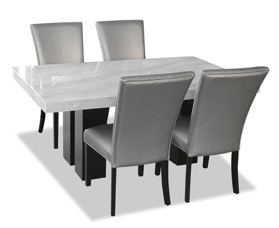 Add some contemporary elegance to your dinner tonight with this Cami five-piece grey dining room set. Pure white marble decorates the top and sides of the table, with veins of contrasting colour running through the stone for an extra pop of natural style. Smooth, grey faux leather lends a smoky touch to your dining space, while supple memory foam makes your chair seat extra comfortable. A row of glittering silver nailheads line the edges of the seat and the back to add a layer of sparkle. Add this Cami set to your dining space and let this stone-cold stunner add a dash of sophistication to your mealtime.