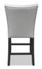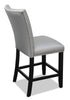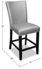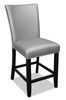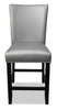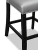 Add some contemporary elegance to your dinner tonight with this counter-height Cami grey dining chair. A tall, gently curving seatback rises up to keep your posture perfect. Smooth, black faux leather adds a dark touch to your dining space, while supple memory foam makes your seat extra comfortable. A row of glittering silver nailheads line the edges of the seat and the back to add a touch of sparkle. Horizontal boards attached to the hardwood legs give you a convenient spot to rest your feet. Sink into the Cami and let dinnertime become the highlight of your day.