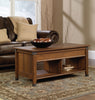 Add rustic warmth to your living space with this Carson Forge coffee table. Easily lift the tabletop up and out to create a handy workspace or impromptu dining table. Underneath the top, you can tuck coffee table clutter out of sight in the hidden compartment and display your favourite reading material on the lower shelves. Plus, the Washington cherry colour and metal hardware give this table a genuine rustic vibe.