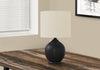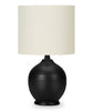 Create a timeless ambiance with this transitional style 17"h table lamp. With a rounded teardrop, black ceramic footed base and subtle textured finish contrasted with an ivory linen drum shade, this decorative lamp will instantly brighten up your living room, office, or bedroom. The simple rotary switch houses a single bulb (not included) for a maximum output of 60W/120V to illuminate a space. Attached with a 5ft black cord, this is the perfect functional accent to place on an end or side table, nightstand or bedside table. Made with quality materials for longevity, this lamp includes a 2-year limited warranty against any manufacturer's defects for a worry-free purchase.