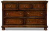 Add a traditional touch to your bedroom with this Chelsea dresser. Of the seven functional drawers, each slides in and out effortlessly. All drawer fronts are decorated with detailed frames and antique brass-finished hardware. The top drawers are each lined with felt for extra special treatment for your personal treasures. The radiant cherry veneers look ravishing in natural light, making for a classic colour that tends to grow richer in character with each passing year. Behind the veneers, pine solids keep this piece strong yet relatively lightweight. Enjoy this piece on its own or else pair it with the matching mirror from the same collection (sold separately).