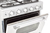 With its iconic retro look and throwback chrome accents, this 30” Classic Retro stove is the perfect addition to any kitchen design that harkens back to the '50s. Along with classic good looks, this stove also features the convenience of convection cooking, which circulates heat for incredibly even distribution to speed up cooking time. Plus, a waist-high broiler allows you the option of intense searing at a height that’s comfortable. The simple, effortless controls are easy to use, quick to keep clean and add an extra retro touch.