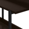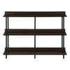 Proudly display prized possessions on this rectangular console table with 3-tier shelving. Underneath the long, narrow tabletop are shelves arranged on 2 levels. Distribute books, plants, and decorative items among the tabletop and shelves, which are in an elegant dark-brown espresso laminate finish. The sturdy metal frame in a contrasting black finish features clean lines and right angles for a modern look. With its narrow profile and generous display space, this versatile accent table with storage is ideal for a hallway, an entryway, or behind a sofa in a living room.