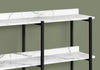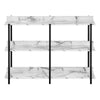 Proudly display prized possessions on this rectangular console table with 3-tier shelving. Underneath the long, narrow tabletop are shelves arranged on 2 levels. Distribute books, plants, and decorative items among the tabletop and shelves, which are in an elegant white marble-look laminate finish. The sturdy metal frame in a contrasting black finish features clean lines and right angles for a modern look. With its narrow profile and generous display space, this versatile accent table with storage is ideal for a hallway, an entryway, or behind a sofa in a living room.