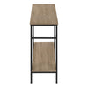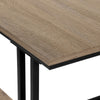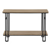 Straight lines, bold angles, and stylish finishes give this 2-tier console table a trendy, modern-industrial look. The black metal base features side connectors that form H-frame accents and 4 open, U-shaped legs that mimic the rectangular shape of the table. Finished in a dark taupe wood-look laminate, the tabletop and bottom shelf panels offer ample room for decorative items. The generous space between the tabletop and storage shelf provides a great spot for taller décor items. Versatile and compact, this long accent table with storage can be used in rooms with limited space, like an entryway or a hallway, or as a sofa table in a living room.