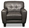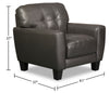 Get ready to relax and unwind on this grey-hued Curt chair. This piece features button-tufted cushions and fabric piping on all of the seams for an elegantly modern take on retro furniture design. You'll love welcoming friends and family into your space and onto the genuine leather seating area. When you take a seat, you'll be instantly comforted by the high-density foam inside the cushions. With black-finished feet to provide support with style, this Curt chair adds sophistication and charm to your home.