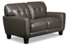 Get ready to relax and unwind on this grey-hued Curt loveseat. This piece features button-tufted cushions and fabric piping on all of the seams for an elegantly modern take on retro furniture design. You'll love welcoming friends and family into your space and onto the genuine leather seating area. When you take a seat, you'll be instantly comforted by the high-density foam inside the cushions. With black-finished feet to provide support with style, this Curt loveseat adds sophistication and charm to your home.