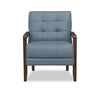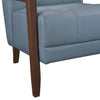 Effortlessly graceful and elegant in every aspect, this Enzo accent chair is a paragon of timeless style. Wrapped in gorgeous light blue genuine leather along the front seating area and faux leather on the back and sides, this piece will make any room feel complete. Its stunning wood frame complements the light upholstery to create a picturesque display of mid-century modern and retro designs. Plus, biscuit tufting accentuates plush cushions, reinforcing this chair’s vintage aesthetics. Lean back in sophisticated style as you revel in comfortable high-density foam cushions and sleek, eye-catching details with the Enzo.