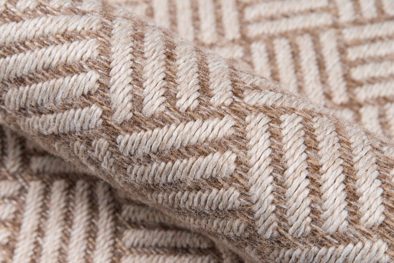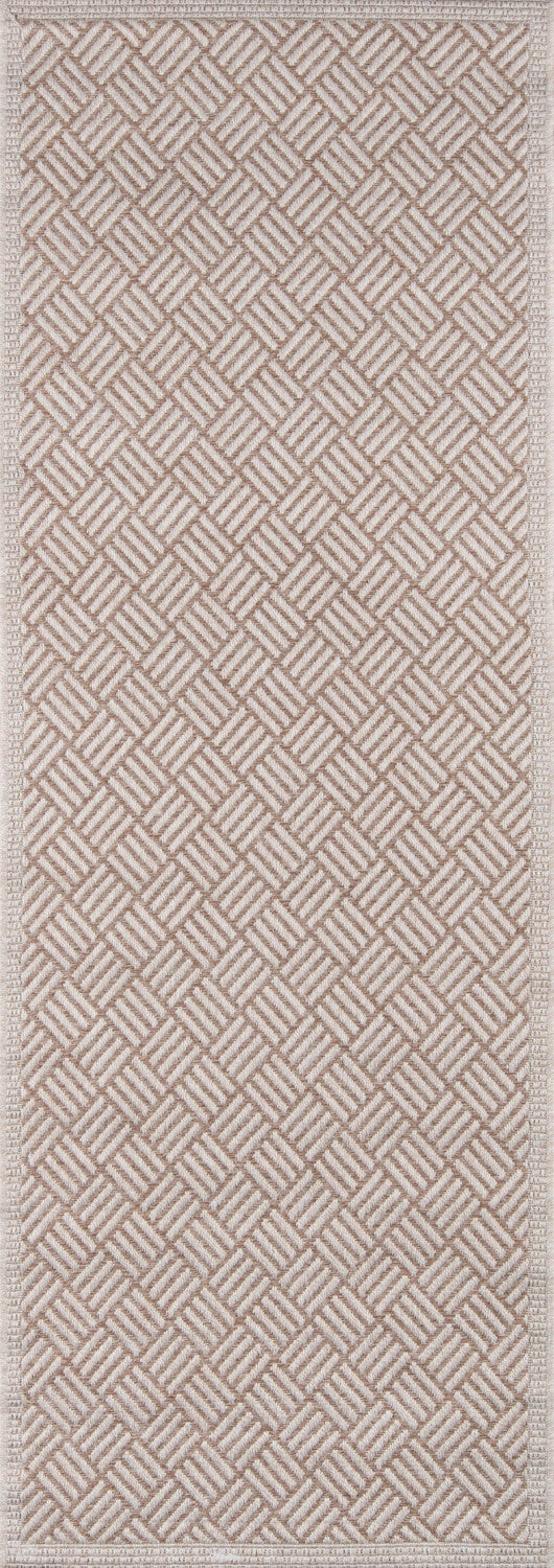 The island style of this indoor/outdoor area rug adds a touch of tropical texture in interior and exterior settings. The geometric rug design is seemingly simple from afar, but closer inspection reveals an intricate basketweave design interwoven from contrasting tan and ivory threads. Precision made from polypropylene fibers, the all-weather rug is a stain-resistant floorcovering suitable for styling both interior and exterior environments.