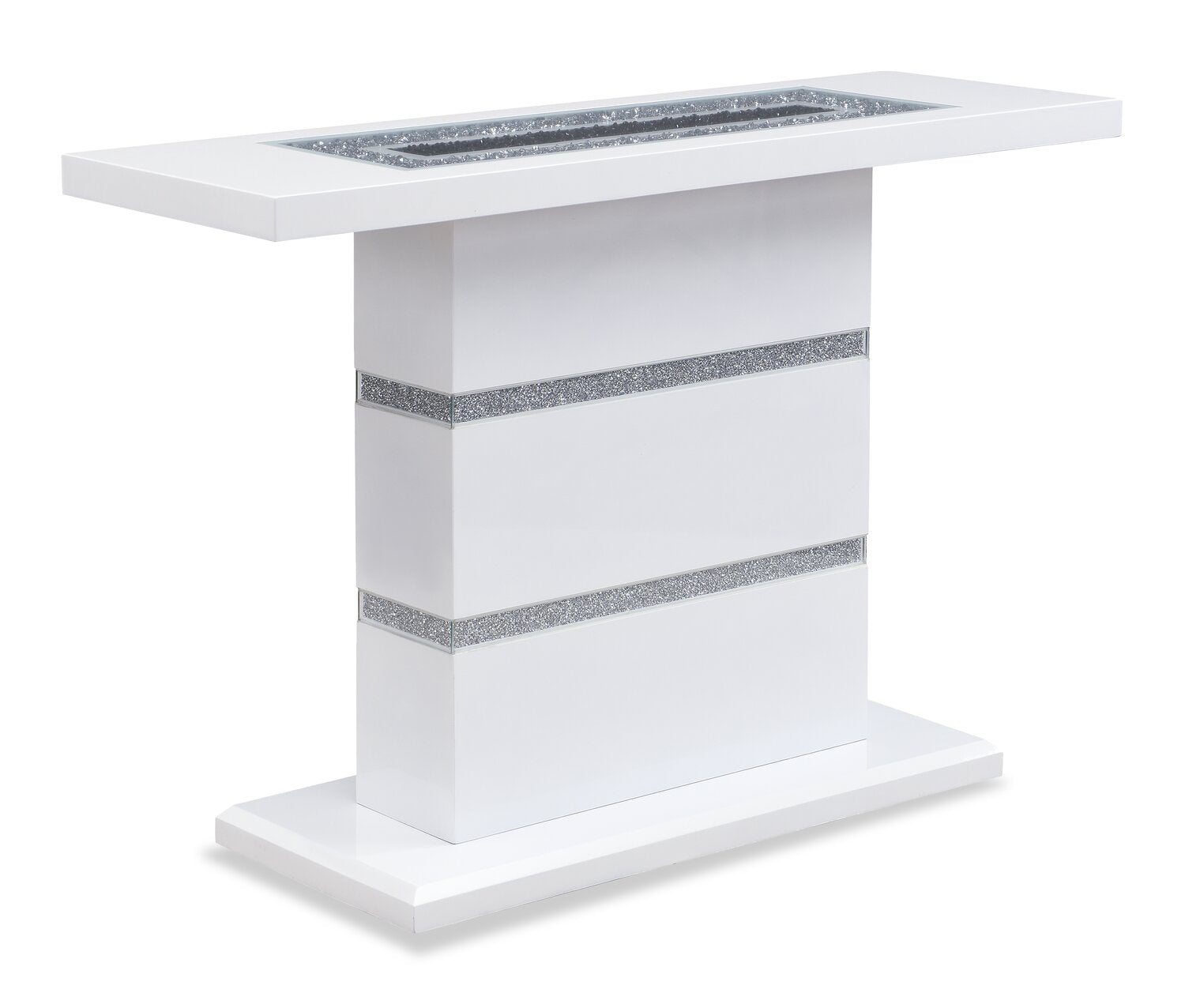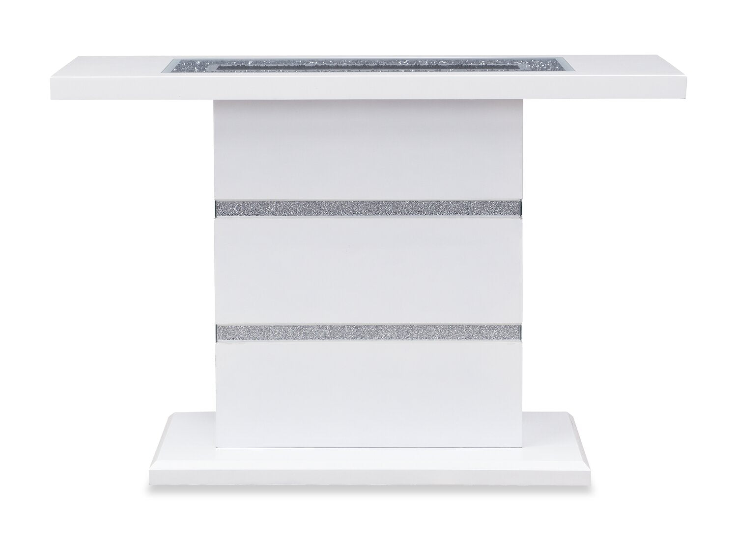 | Accent Details | Two silvery bands wrap around the pedestal base, while silver and black beads fill the tabletop's centre. |