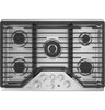 Upgrade your built-in cooktop to this modern, stainless steel GE gas model. Don't feel like cleaning after an evening of cooking" Put the porcelain-coated, dishwasher safe grates through a cycle for a quick clean. No mess or elbow grease required. This model features a recessed surface to help contain spills and make cleaning easy. With five powerful sealed burners, including an 18,000 BTU PowerBoil element, you can sauté, fry or steam to your heart’s content. Brightly lit knobs make it easy to adjust the precision controls to the perfect temperature, no matter what the light is like.