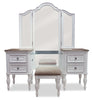 Embrace the feeling of having a secret, countryside retreat in your own home with this stunning Grace vanity. The spacious tri-fold mirror closes to reveal 12 jewellery hooks on the glass' felt-lined back. A duo of USB ports and a pair of 120 volt outlets are tucked under the glass shelf to blend modern convenience with traditional charm. Accented by antiqued brass handles and brushed oak tops with a distinct rounded-butterfly design, this set will help make your bedroom into the relaxing cottage of your dreams.