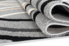 Curvy lines undulate across this retro rug in a soundwave-like pattern. The black, grey, cream and taupe stripes rest against a smoky grey background for a sophisticated, modern look. Machine woven for durability, the densely packed polypropylene threads are stain resistant and colourfast. Serged edging features tightly wrapped thread along the sides that helps prevent fraying and keeps a tidy appearance, while the reverse side is strengthened with a woven jute and polypropylene backing so this rug keeps its elegant appeal day after day.