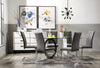 | Accent Details | A pair of ovals made from grey and white wood makes up the pedestal of the table. A lighter stripe of grey fabric runs down the centre of the chair. |