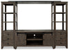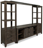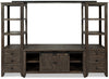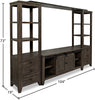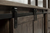 This Madison 60-inch four-piece entertainment unit is here to add some serious farmhouse style to your living room. Slide the double barn-style doors apart to reveal extra storage space and keep electronics tucked neatly out of sight but easily within reach. Integrated cord management keeps messy wires at bay, while the piers’ tall open shelves and bridge spanning between the piers provide the perfect place to keep photos and other home decor pieces. With its handsome brown finish and exposed door rails, this country-chic TV console is a beautiful and trendy focal point to any living room.