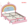 The upholstered rainbow princess bed combines playful design with practical functionality. Featuring a vibrant rainbow-inspired headboard and soft velvet upholstery, it brings cheerful style and comfort to any bedroom. The sturdy platform frame eliminates the need for a box spring, while built-in storage drawers provide a convenient place to keep bedding, clothes, or essentials neatly tucked away. Supported by durable