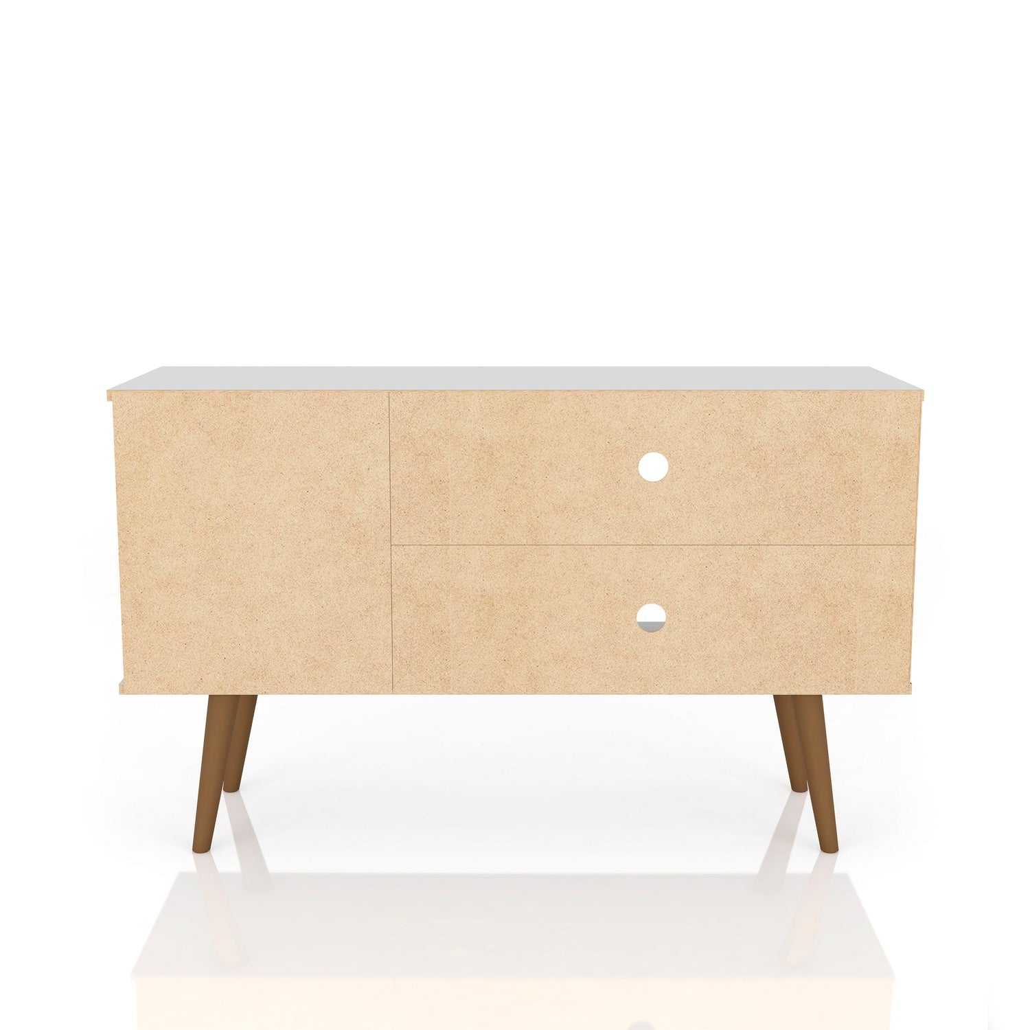 The Liberty 42.52 Mid-Century Modern TV Stand is the perfect blend of quality craftsmanship, brilliant design, and purposeful functionality. Featuring 2 open shelves, and one hidden cubby to create the ultimate entertainment center perfect for stashing DVDs, board games, electronics, and media accessories. Free standing and easy to maneuver, this piece will mix well with any decor and its artful grooves will create a statement in any space.