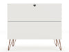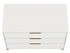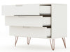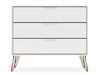 The Rockefeller dresser is the perfect accompaniment to any bedroom space, with ample storage and minimalistic Mid-century modern style. Cutout handles keep the piece feeling fresh with three drawers made easy for stowing away clothing, personal items, and beyond. A display top allows for sharing favorite framed family photos, travel trinkets, perfume trays, or a decorative lamp. Set it under a mirror or painting to complete your space with this instant bedroom focal point.