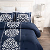 Add a touch of traditional design to your space with this three-piece Navy Damask comforter set. A bold navy background plays host to the white damask print running down the centre of the comforter and pillow shams to make a statement in any bedroom. Fibre batting is held inside the blanket with stitch-tufting on the outside so you won't need to worry about the filling shifting around over time. Plus, details like the mitred finish on the comforter edges elevates these pieces to provide a high-end look.
