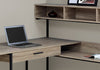 Give yourself breathing room while you work with this spacious Oaklee desk. On the left are two fixed, open shelves that are accessible from all sides. The large desktop panel overlaps the storage unit on the right to create a second, lower work surface. Suspended above is a hutch with three cubbies. For storing small supplies, this corner desk includes one storage drawer with a metal handle. A slim metal base in a contrasting finish supports the laminate panels. This L-shaped computer desk saves space when used in a corner but is finished on all sides for a polished look wherever it is placed in an office.