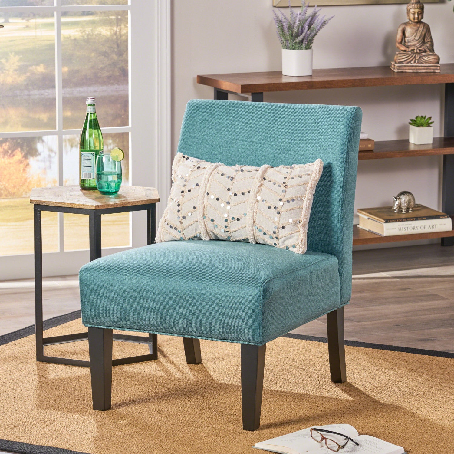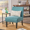Add a stylish pop of color to your living space with the accent chair in vibrant teal. This modern piece features a sleek silhouette,soft fabric upholstery,and supportive foam cushions for all-day comfort. The solid rubberwood frame in an espresso finish offers durability and elegance,while the gently tapered legs add a refined touch. Whether used as a reading chair or a decorative accent,it elevates any room with ease. Assembly is required,and all necessary tools and instructions are included for quick setup.