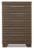 Add a splash of contemporary flair and a burst of fresh style to your home with this Olivia chest. Understated details including carefully scalloped hollows and sleek pewter handles bring modern sophistication to your space, complementing affordability with elegance. Rest at ease knowing this Olivia piece will bring you long-lasting glamour thanks to high-quality engineered wood finished with laminated wood grain.