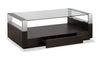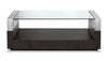 | Accent Details | Chrome-plated end caps support the tabletop in chic style. A clear glass tabletop pairs well with the wood structure and metal accents to create a modern display. |
