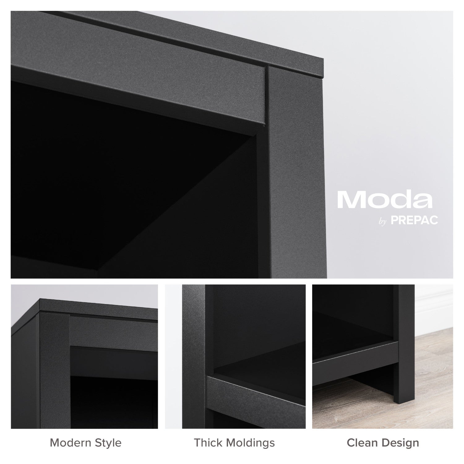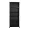 The Moda Bookcase Storage Cabinet features a sleek black finish and bold moldings, perfect for use as a buffet, bookshelf, or display cabinet. Standing 80 inches tall, it offers five shelves, three adjustable, and durable, non-toxic materials.