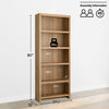 The Moda Bookcase Storage Cabinet Collection from Prepac stands 80 inches tall with five shelves (three adjustable) that hold up to 20 pounds each. Its sleek design and warm oak finish make it ideal for various uses, arriving flat-packed for easy assembly.