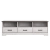 The Rustic Ridge TV Stand blends modern design with farmhouse charm, measuring 66” W x 20” H x 16” D, providing ample storage for media devices. Constructed from durable materials, it offers concealed and open shelving for versatile organization.