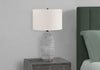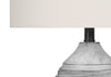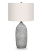 Bring some modern sophistication to any room with this stylish 27"h table lamp. A beautiful blend of a textured grey resin vase-shaped base designed with organic flowing lines, an ivory linen drum shade, and finished with a contrasting black metal finial on top, this lamp is a great way to brighten any bedroom, living room or office. With a 3-way switch that houses a single bulb (not included) for a maximum output of 100W/120V, this lamp offers three levels of illuminating light for creating the ambiance you desire. Attached with a 5ft transparent cord, this is the perfect functional accent to place on an end or side table, nightstand or bedside table. Made with quality materials, this lamp includes a 2-year limited warranty against any manufacturer's defects for a worry-free purchase.