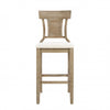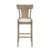 This bar stool is textured with a brown finish that is completed with a hand applied washed finish to give it a rustic and vintage appeal. The eye-catching back draws attention with its swooping sides, straight lined top rail, and hand woven rattan center detail. The easy to maintain seat is upholstered in 100% polyester fabric that mimics the look of a beige linen. Solid wood construction and footrails provide comfort and stability. The 30" seat height is perfect for any counter with heights of 41" to 43".