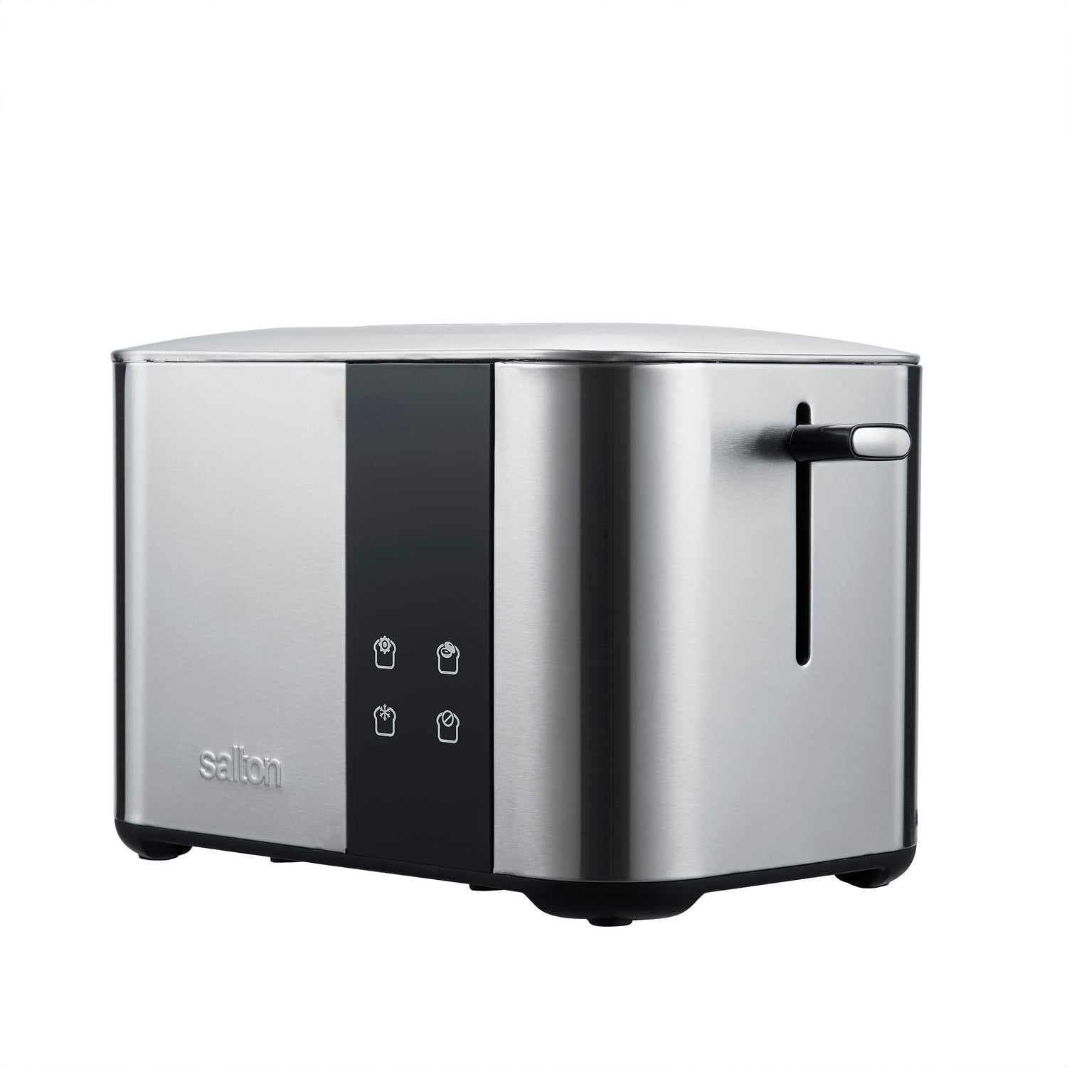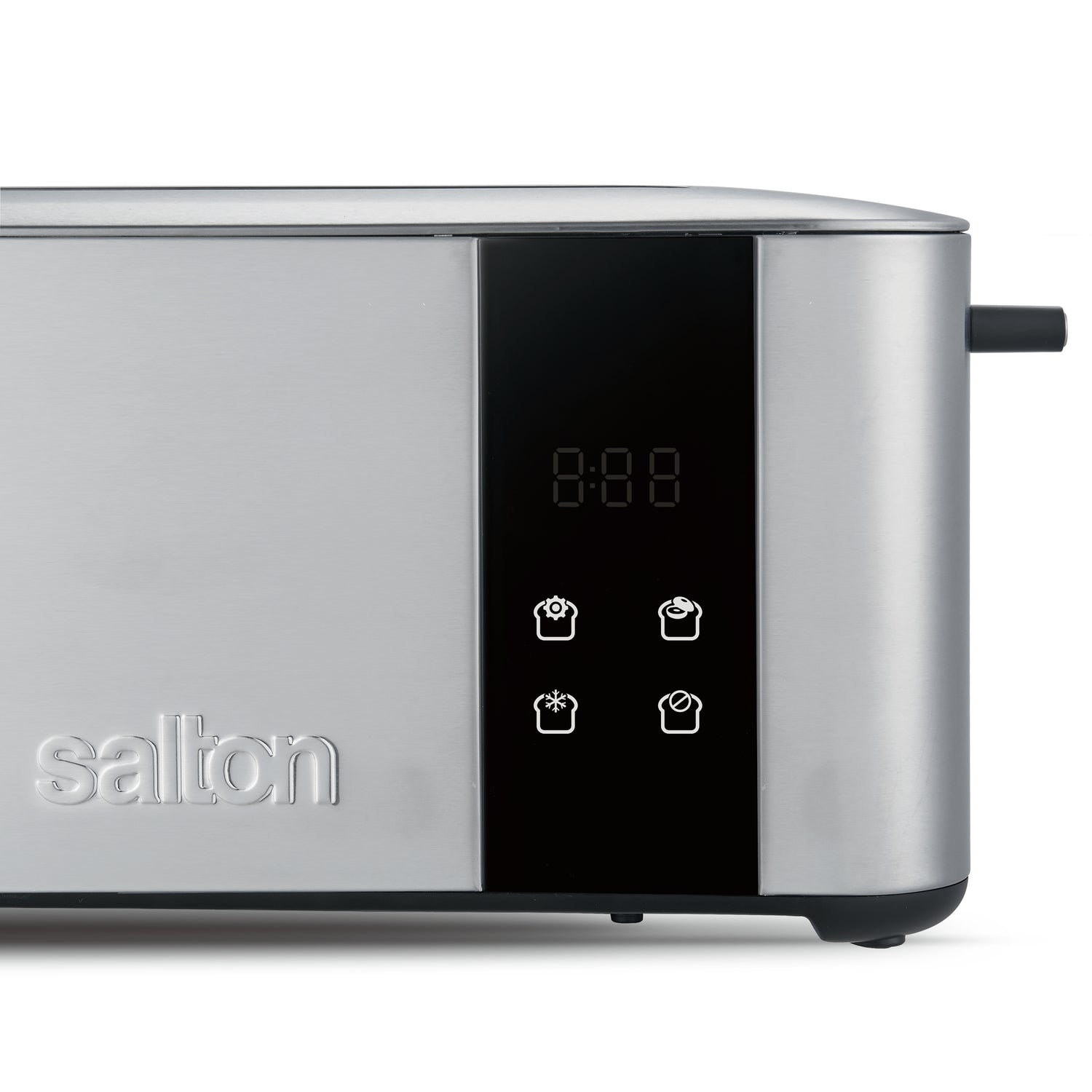 The sleek style of the Salton Digital Long Slot 2 Slice Toaster will enhance any countertop all the while saving space. One size fits all! The long slot design allows you to toast any size waffles, bagels, and artisan breads. The extra wide slots can accommodate both thick and thin slices and the electronic sensor ensures consistent results every time. With variable browning control and a stylish, modern design, this new take on a classic appliance is a kitchen must-have!