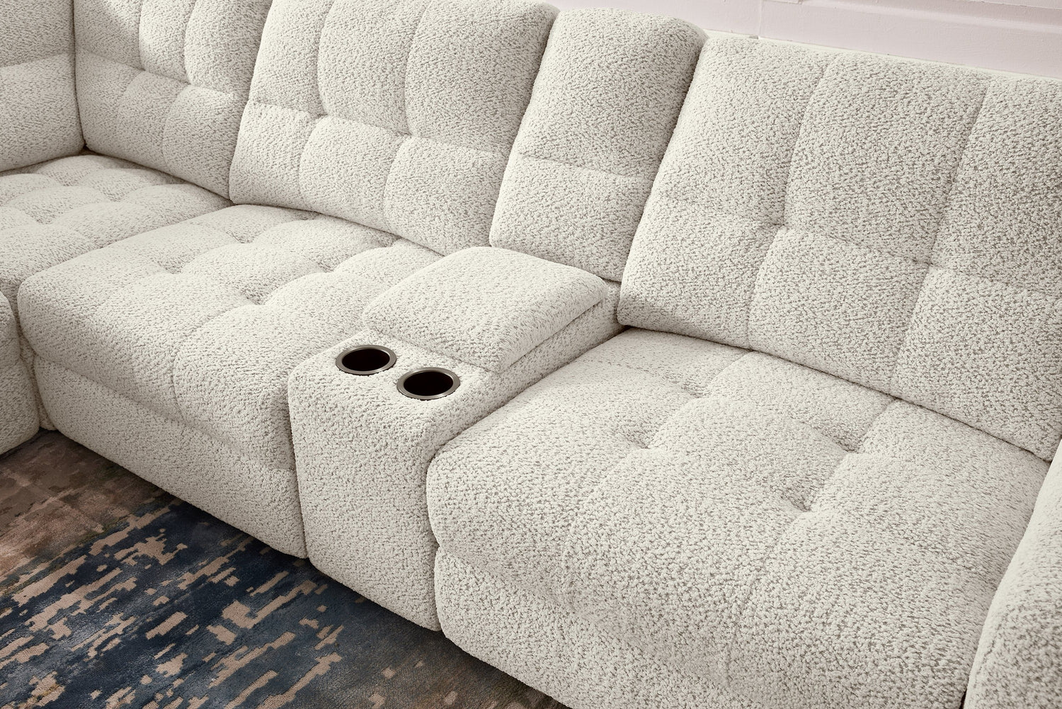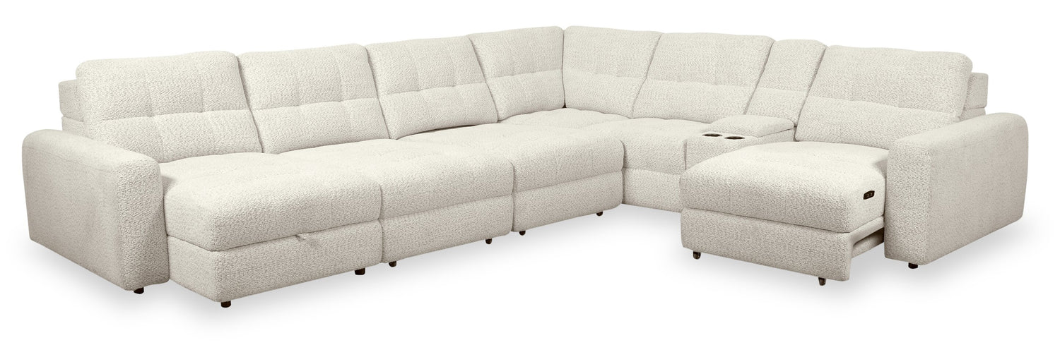 Transform your space with this Scott Living Elevate seven-piece sectional. Featuring a modular design with power sliding chairs, storage chaise and console, this piece will surely be a unique addition to any home. Constructed with comfortability in mind, it’s swathed in soft chenille fabric, boasts high-density foam cushions and features power sliding chairs. With a quick press of a button, you can stretch out your legs and enjoy great drinks and snacks thanks to the dual cupholders and storage console. Allow the Elevate to become your new versatile and comfortable companion at home.